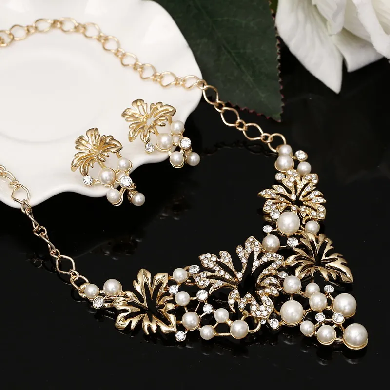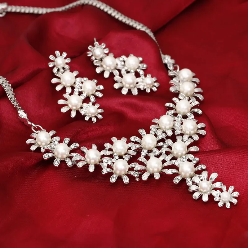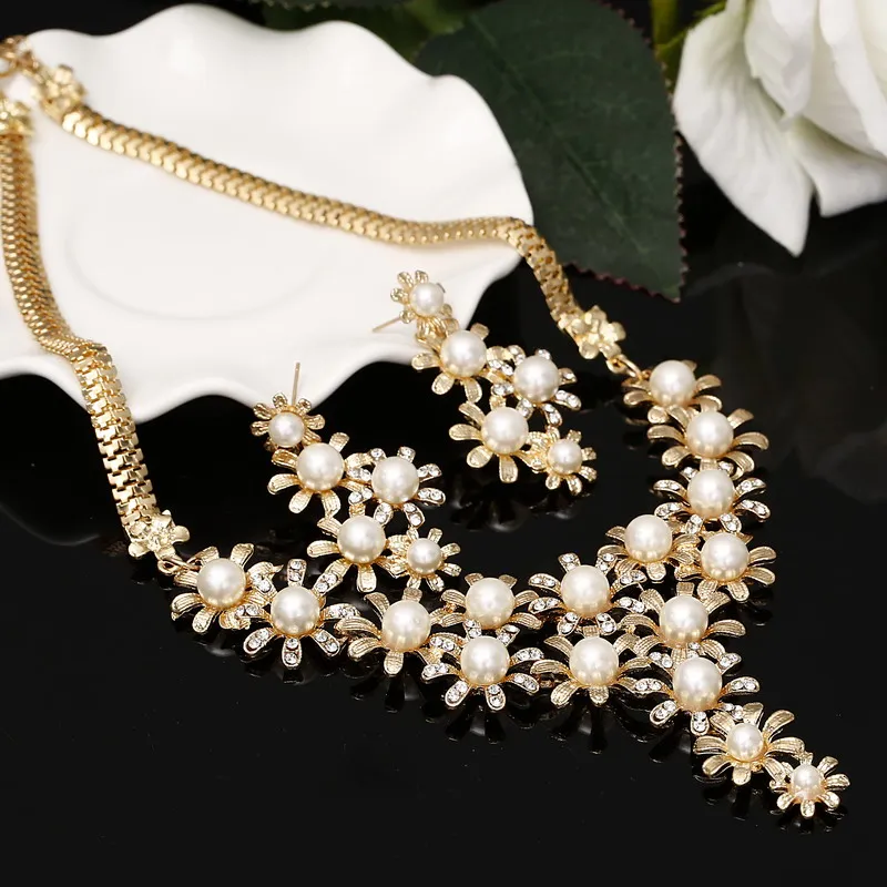 New Fashion Simulated Pearl Jewelry Sets Women Crystal Wedding Bridal Flower Gold Silver Chain Pendant