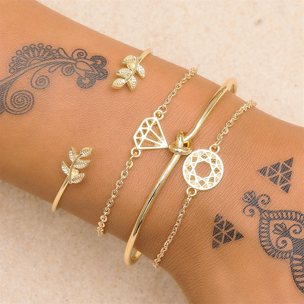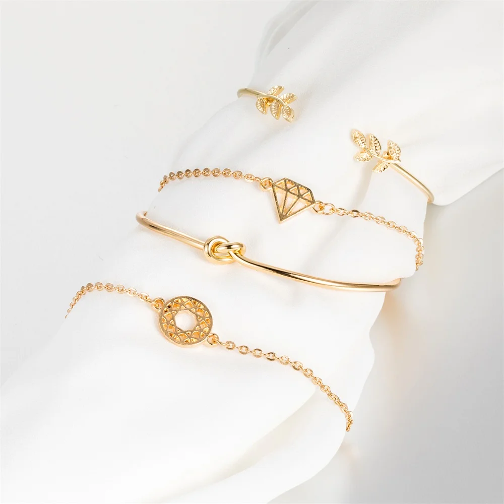 Promo KISSWIFE 4 Pcs/Set Bohemian Leaves Knot Round Chain Opening Gold Bracelet Set Women Fashion Apparel
