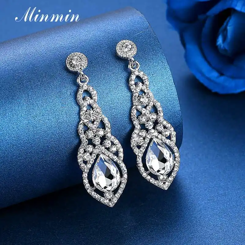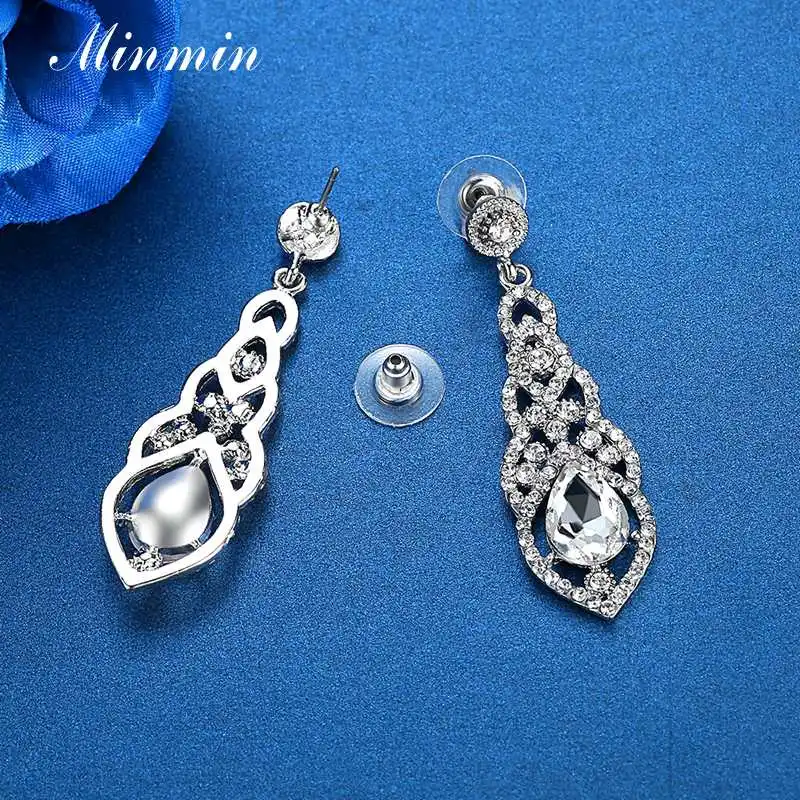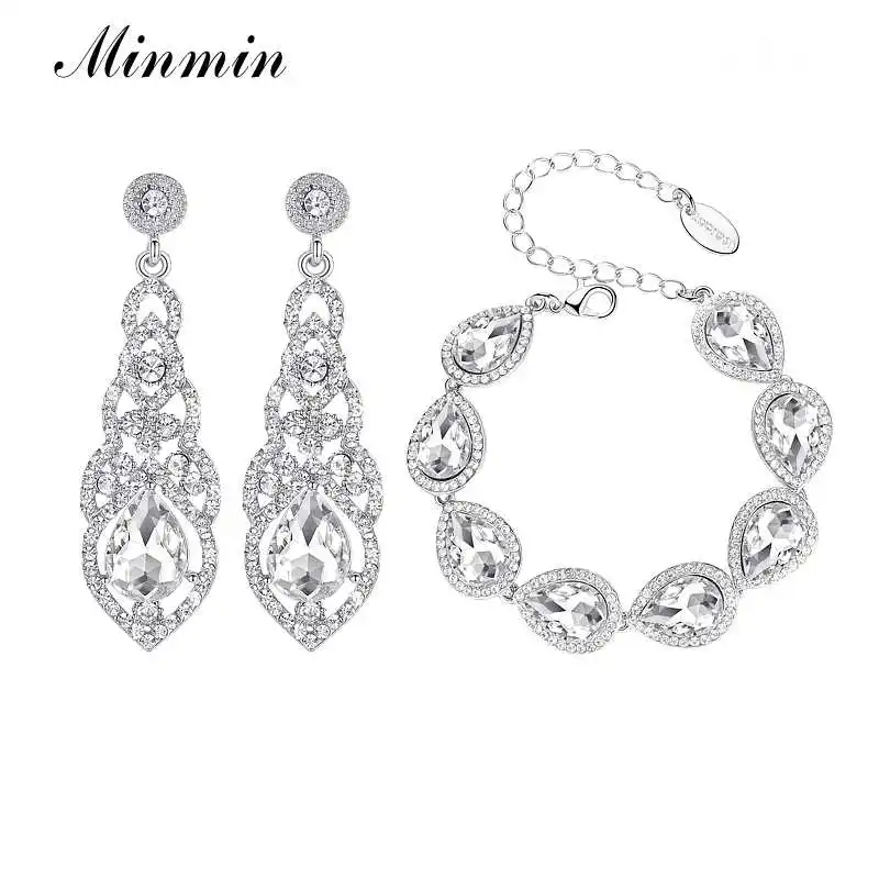 New Minmin Silver Color Luxury Crystal Wedding Earrings Bracelet Set for Women Teardrop Shape Bridal Je